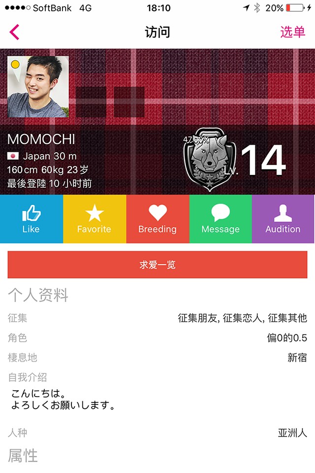 在喜欢的对象页面内能看到自我介绍,角色等资料。如果觉得是菜的话,也能直接传讯息给他。
